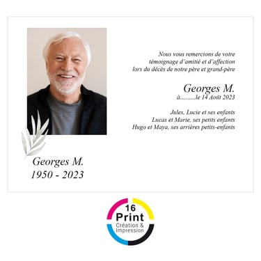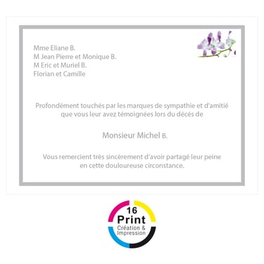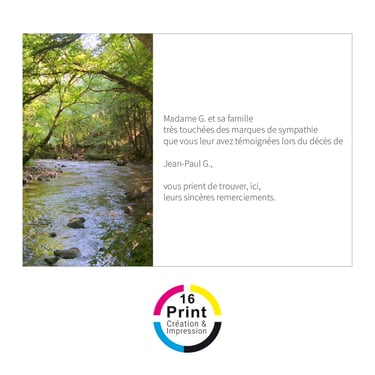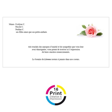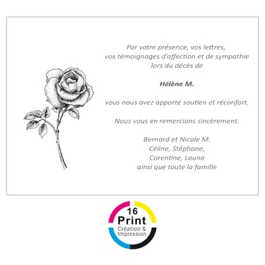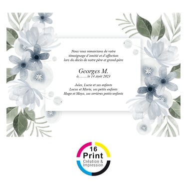 Dans les moments délicats qui suivent un décès, 16 Print vous accompagne avec notre service de création et d'impression de cartes de remerciement. Nos designs respectueux, combinés à une qualité d'impression irréprochable, rendent chaque carte de remerciement significative et mémorable. Chez 16 Print, nous comprenons l'importance de ces gestes en période de deuil et nous sommes là pour vous aider à transmettre votre reconnaissance avec dignité et empathie.
