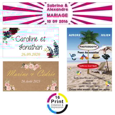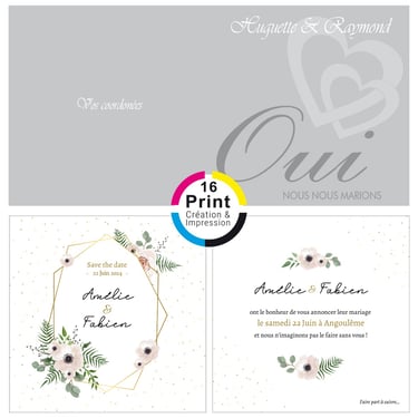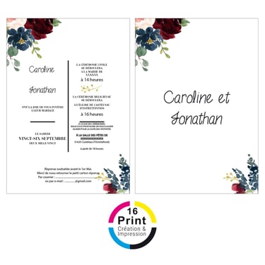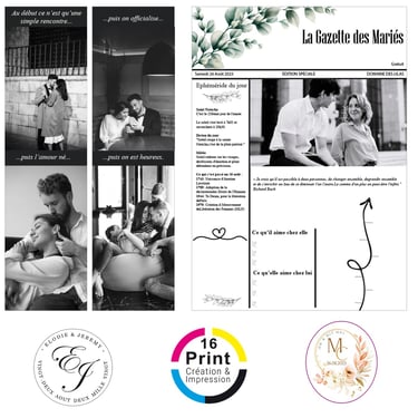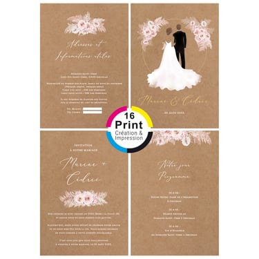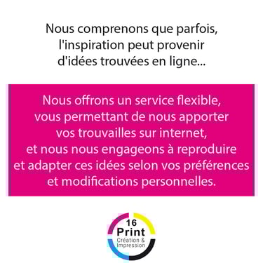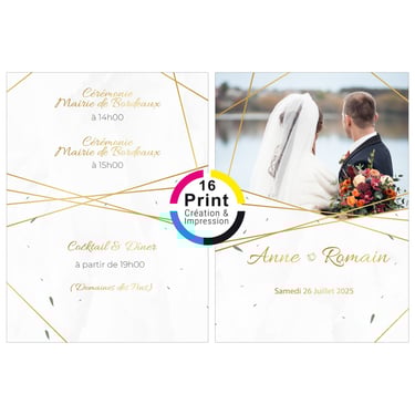 Plongez dans l'univers personnalisé de 16 Print, où la créativité s'étend bien au-delà des faire-part de mariage. Découvrez notre expertise dans la conception de livrets de messe, menus, cartes de plan de table, gazettes, invitations pour retraite, cartes d'anniversaire, marque-pages, bannières, arbres à empreintes, et bien plus encore. Choisissez parmi notre collection de modèles existants que nous personnalisons avec soin pour chaque occasion, ou apportez-nous vos inspirations uniques, même si vous avez trouvé le design parfait en ligne, et laissez-nous le recréer avec une touche personnalisée. Chez 16 Print, nous sommes là pour répondre à tous vos besoins d'impression, en vous offrant la flexibilité de choisir parmi notre sélection ou de créer quelque chose de totalement unique pour chaque moment spécial de votre vie. Avec notre expertise en design et impression de qualité, chaque pièce devient une création exceptionnelle qui raconte votre histoire de manière mémorable.