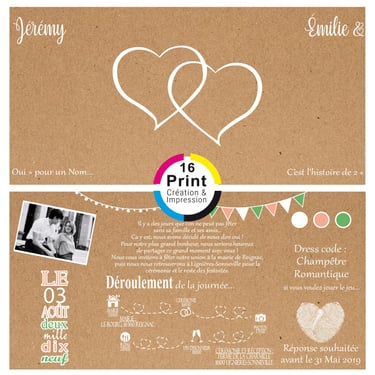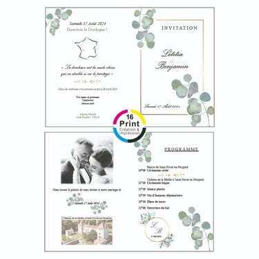 Faire-Part de mariage, livret de messe, Menu, Carte plan table, gazette de mariage, invitation retraite, banderole, arbre à empreintes, marque-page etc...